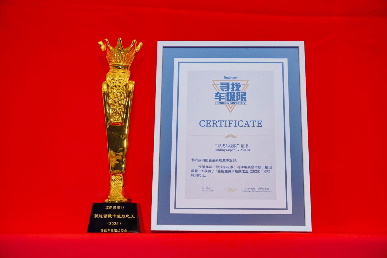 2025年12月10日,在“第九届寻找车极限”活动现场,经组委会专家组专业评审,福田风景T7凭全维度能效优势成功摘得“新能源微卡能效之王(2025)”荣誉。这一结果有力印证:当末端物流开启以能效为主的发展新时期,风景T7微卡已为行业树立了新典范。